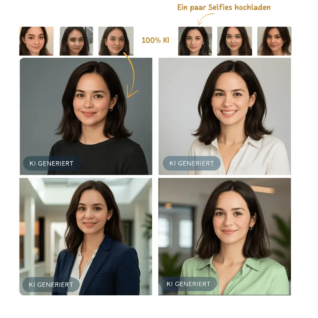 Diese KI-generierten Bewerbungsfotos entstanden aus einfachen Selfies. Sie zeigen, welchen Qualitaetssprung ein professionelles Bild macht.